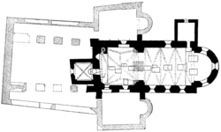 Originalmente su planta era de cruz latina, con triple nave y un transepto con ábsides en ambos brazos. El campanario exterior del norte, la sacristía, en el costado norte del coro, y el porche, en el costado occidental, son construcciones posteriores.
