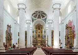 La iglesia, conforme al proyecto de Covarrubias, es de planta de salón columnaria, dividida en tres naves, con gruesos contrafuertes al exterior y ábside pentagonal. Las naves del templo están separadas por gruesas columnas toscanas que soportan arcos de medio punto. Las columnas constan de un pedestal de 1,50 m de altura, rematado en su parte superior por varios anillos de diferente grosor. Los fustes son lisos y cilíndricos, de unos 7 m de altura. Los capiteles dóricos soportan cada uno un trozo de entablamento, con un friso, completamente ortodoxo, en el que alternan triglifos y metopas, también cilíndrico, y una cornisa cruciforme. El modelo podría haberse tomado de la traducción de los libros de Serlio. Un entablamento igual, con cornisa muy saliente dividida en bandas, recorre los muros del templo a la misma altura y a ellos se adosan semicolumnas iguales a las columnas de las naves. La nave central está cubierta por bóvedas vaídas, mientras que las laterales se cubren con bóvedas de cañón con lunetos, decoradas unas y otras con yeserías barrocas, correspondiendo a lo proyectado por Gómez de Mora. El crucero se cubre con cúpula sin tambor, apoyada directamente sobre las pechinas, y presenta gruesas nervaduras semejantes a las que se emplean en el cuarto de esfera del ábside.
