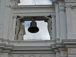 Las ventanas son abovedadas y los dos campanarios tienen una cúpula chinesca.