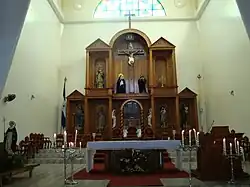 Cabecera de forma cuadrada con bordes esquineros enmarcados por elementos adosados asemejando pilastras angostas en los lados del cuerpo, sus paredes adornadas con bellas estaciones del vía crucis, con marco de madera asemejando un templo, donado por las familias adineradas de la ciudad y fondos de la parroquia, durante el curato del Presbítero Wester López.