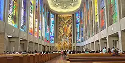 El campanario contiene 12 campanas traídas de los Países Bajos por Petit & Fritsen. La catedral en sí es de hormigón con el exterior cubierto de piedra caliza de Alabama. La catedral se caracteriza por su gran extensión de espectaculares vidrieras hechas a mano en París, Francia y el mural de baldosas de cerámica detrás del altar que representa a "Cristo en la gloria", que es el más grande en el mundo. La capacidad de la catedral es de alrededor de 1.880 personas, incluyendo las dos capillas laterales. También hay una iglesia inferior por debajo de la iglesia superior.