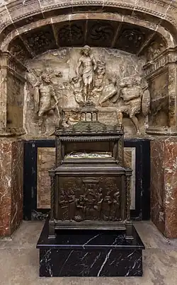 Los relieves de mármol importados de Génova que ocupan las hornacinas que deja el segundo cuerpo representan escenas de la vida de san Vicente mártir, san Francisco de Borja, san Pascual Baylon y los santos Bernardo, María y Gracia, y se deben en el cincel de Daniel Salanova en 1687.