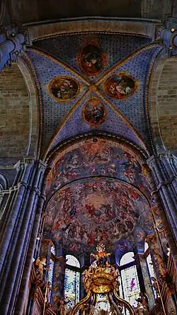 La nave mayor se cubre con bóveda de cañón apuntado y los laterales con bóveda de cañón y arista, de nervios en el crucero, y bóveda de cañón con lunetos en el triforio. Las ventanas del triforio son de arco agudo o apuntado al interior y al exterior.