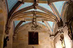 1. Bajo esta hilera de símbolos santiaguistas y situados en los ángulos, se observan dos motivos peculiares, el conopeo, un elemento textil de forma cónica, y el tintinábulo, una pequeña campana que se enmarca dentro de una corona. Estos distintivos se concedían a las iglesias con título de basílica y en nuestros días no tienen valor litúrgico: Raquel Cilla López y Jesús Muñiz Petralanda, Guía del patrimonio religioso del Casco Viejo de Bilbao.
