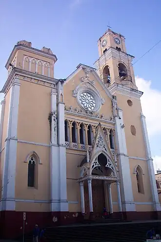 La fachada principal está conformada por tres cuerpos, todos en estilo neogótico. El primero consta de un frontón levantado por columnas esbeltas, el cual forma un arco ojival trilobulado. En el segundo cuerpo están las ventanas del coro (siete en total), de forma ojival. El tercer cuerpo, está rematado por un rosetón.