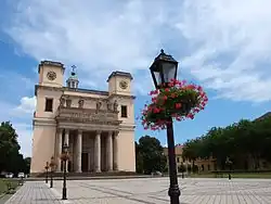 La diócesis fue fundada en el año 1004 bajo Estaban I. La iglesia actual es la quinta estructura en este sitio. La primera catedral fue construida en 1074, el mismo sitio de la actual, pero fue destruida en el siglo XIV, durante las invasiones de los mongoles. Durante la ocupación otomana de Hungría los últimos restos de la pared se derrumbaron. Algunos de los restos todavía son visibles hoy en día. Sólo después de la salida de los turcos fue posible construir una nueva iglesia.