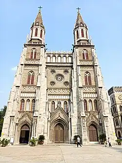 La catedral fue construida durante los años 1901-05 (y ampliada de nuevo en 1906) . El proyecto de construcción fue financiada con fondos de la indemnización que se estipularon en el Protocolo Boxer. El diseño básico de esta iglesia de estilo gótico es de cruz latina, con dos altas torres. Es una reminiscencia de la catedral de Notre Dame de París (Nuestra Señora de París). El edificio principal de la iglesia cubre 1650 metros cuadrados y tiene capacidad para unas 800 personas .