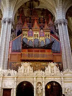- Gótico: del siglo XIV y factura gótico-mudéjar, sobre todo en los cuerpos superiores del ábside y en la capilla funeraria de san Miguel o «Parroquieta», que aloja el sepulcro del arzobispo don Lope Fernández de Luna, asimismo gótico. Las naves y cubiertas del templo también mantienen este estilo a lo largo de diversas ampliaciones desde el siglo XIV al XVI. Del siglo XV data la sillería del coro y el magnífico retablo mayor de alabastro polícromo realizado por Pere Johan y Hans de Suabia, que está considerado como una obra capital del gótico final europeo. El museo de tapices flamencos alberga telas de los siglos XIV al XVIII, y está considerada como una de las tres mejores colecciones del mundo.