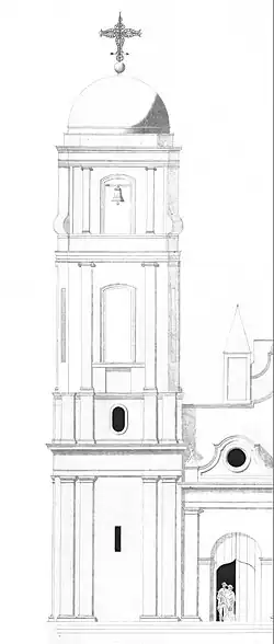 En el primer cuerpo, de planta cuadrada, se dispuso de pilastras dóricas pareadas (6,58 M) en las esquinas siguiendo de cierta manera el modelo utilizado en el primer cuerpo de la portada central de la fachada, y a remembranza de las torres diseñadas por Juan de Herrera para la Catedral de Nuestra Señora de la Asunción en Valladolid, en el medio se ubicó un pequeño vano rectangular para el paso de la luz, sobre el entablamento del primer cuerpo se ubicó un ático a manera de alto pedestal corrido, ortogonal, siguiendo las líneas verticales del primer cuerpo, la altura de este ático o pedestal se justificaba por la extensión del paño o muro que formaba el aletón o voluta de la fachada, en el medio de este pedestal se realizó un óculo ovalado vertical . En el segundo cuerpo, como ya se anotó, se dispuso de dos estiradas pilastras jónicas (6,06 M) por cada lado del campanario con entablamento modificado, en medio de estas pilastras se dispuso de una alta ventana de arco rebajado similar a la del segundo cuerpo de la portada central de la fachada, en las esquinas el achaflanado de este segundo cuerpo se resaltó colocándole un vano vertical estrecho. El tercer y último cuerpo se articuló mediante pilastras jónicas (3,03 M) sobre pedestal corrido de poca altura, en el espacio central se dispuso al igual que en el segundo cuerpo de una ventana alta de arco rebajado y para las esquinas se trazaron volutas en un intento de armonizar fachada y campanario; finalmente se coronó el campanario con un domo o cúpula de media naranja lisa asentada sobre una base achaflanada y rematada con bola sobre la cual se colocó una cruz de hierro que actualmente se ubica sobre la cúpula del templo.