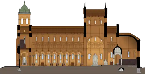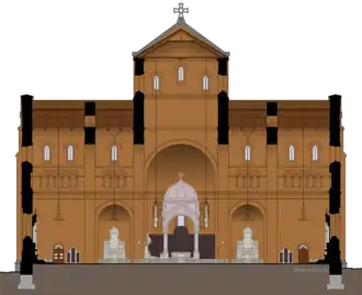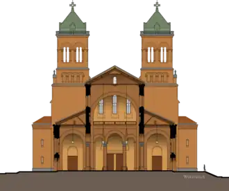 El edificio fue diseñado por el arquitecto francés Charles Émile Carré (1863-1909),[n. 2]​ en estilo neorrománico, cuenta con planta en cruz latina, consta de tres naves longitudinales, a su vez atravesadas por el transepto o nave transversal, y sus dos torres tienen 53.20 m metros de altura hasta la cruz.[2]​ Cuenta con 4608 m² en la planta general y 7300 m² de área total construida.[2]​ La basílica es una gran estructura de ladrillo macizo, pues para su construcción se utilizaron aproximadamente 1 120 000 ladrillos de 8 decímetros cúbicos cada uno (unidos entre sí con argamasa),[3]​ los cuales envuelven un volumen de 97 000 metros cúbicos.[3]
