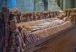 La primera obra custodiada en la catedral vieja, que recibe a todos los que acceden a ella por la entrada principal, es el gran sarcófago de mármol rojo de Verona en el que está sepultado Berardo Maggi, obispo y primer signore de Brescia, que vivió en la segunda mitad del siglo xiii y fue un verdadero hito en la historia de la ciudad. El 25 de marzo de 1298, Berardo Maggi logró la paz entre las dos facciones que desgarraban la vida del municipio, los tradicionales güelfos y gibelinos, erigiéndose como signore de la ciudad y, al ser ya obispo, unificando el poder civil y el temporal en una única figura. Se trata de un gran paralelepípedo compuesto por un solo bloque de mármol rojo de Verona, casi carente de decoración, cerrado por una cubierta a dos aguas ricamente decorada. La obra, de finísima factura y elevado valor artístico, data de los primeros años del siglo xiv, ya que Berardo Maggi murió en 1308. El lado anterior, orientado hacia la entrada de la catedral, está decorado con el Juramento de paz y fidelidad al obispo, la llamada «paz de Berardo Maggi» con la cual se selló la concordia entre las dos facciones. La escena representa dos procesiones de personas que salen una del broletto, a la derecha, y la otra de la basílica de San Pietro de Dom, a la izquierda, es decir, de los dos edificios que simbolizaban respectivamente a las facciones, y se encuentran en un arco central. Aquí, a los lados de un altar, los representantes de las dos procesiones están prestando juramento con la mano sobre un libro, probablemente la Biblia, mientras Berardo Maggi, de pie entre los dos, sostiene entre las manos un largo pergamino que recoge los acuerdos alcanzados entre las facciones. Curiosamente, la procesión de los gibelinos, que proviene de la derecha, es más larga que la de los güelfos, que sale de la izquierda, y por ello la escena central con el juramento está desplazada ligeramente a la izquierda. Evidentemente, la facción gibelina contaba con muchos más miembros y en realidad era así, siendo Brescia fundamentalmente gibelina.[1] También da fe de este hecho la coronación de la escena en el borde superior, constituida por almenas gibelinas. En la cara posterior, por otra parte, está representado Berardo Maggi a tamaño natural, tendido sobre una sábana y vestido con la túnica de obispo y la mitra. En la mano izquierda sostiene el pastoral, mientras con la derecha hace el gesto de la bendición. Al fondo está representada la procesión del Funeral de Berardo Maggi, mientras en las cuatro esquinas de la sábana sobre la que está tendido el obispo están colocados los cuatro animales del Apocalipsis, símbolo de los cuatro evangelistas. En las cuatro esquinas del sarcófago, en el borde de cubos que sobresalen de la cubierta, están representados los Santos Pedro y Pablo en el lado de la Paz y, en el lado del Funeral, los Santos Filastrio y Gaudencio a la izquierda y los Santos Faustino y Jovita a la derecha. Los dos frontones laterales de la cubierta, con forma de trapecio, muestran a un lado una simple cruz griega y al otro el episodio de San Jorge matando al dragón. La única inscripción sobre el sarcófago está situada en el lado del Funeral y es la dedicatoria del sepulcro: «BERARDI MADII EPISC AC PRINCIP UR BRI», es decir, «A Berardo Maggi, obispo y príncipe de la ciudad de Brescia». Originalmente, el sarcófago estaba colocado detrás o a un lado del altar mayor, pero desde allí, en 1571, fue trasladado a la pared de fondo izquierda del transepto y finalmente a su ubicación actual en 1896.