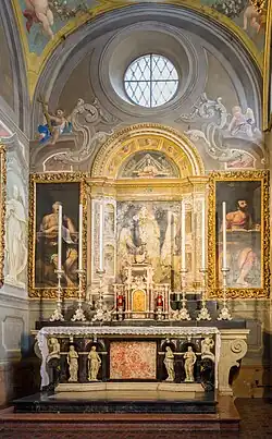 La construcción de esta capilla data de 1572 y, como ya se ha dicho, estaba dedicada inicialmente a santa Justina de Padua, ya que en el día de su festividad se había ganado, pocos meses antes, la batalla de Lepanto. Tras la demolición de la basílica de San Pietro de Dom, que se produjo unos treinta años después, todos los lienzos presentes en esta capilla fueron trasladados a la catedral y se cambió su nombre. Los lienzos que decoraban sus paredes habían sido encargados a mediados del siglo xvi al Romanino y al Moretto.[4] Actualmente, los del Moretto están todavía en la capilla, mientras los dos del Romanino están colocados provisionalmente en el ábside de la concatedral, a ambos lados del retablo. Un último lienzo del Moretto, que forma parte del mismo ciclo, se encuentra en la pared de fondo izquierda del transepto.