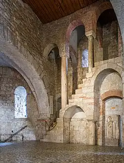 A la derecha de la catedral se abre una zona en la que, mediante un terraplén, se ha recreado el nivel original de la plaza en el momento de la construcción de la catedral. En esta zona se puede observar un arco decorado con sillares de piedra y ladrillos alternativamente: se trata de la entrada derecha del nártex que servía originalmente de acceso a la catedral, la cual carecía, por tanto, de entrada frontal.[3] La otra entrada del nártex, situada de manera simétrica respecto a la entrada actual, se encuentra actualmente enterrada bajo la plaza.