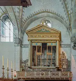 La gran bóveda de crucería que cubre el presbiterio del siglo xiii, como ya se ha dicho, está decorada completamente con frescos que, descubiertos y restaurados en 1957,[4] se han conservado óptimamente hasta nuestros días. En los cuatro plementos, dentro de tondos, están colocados los símbolos de los cuatro evangelistas, mientras en las lunetas están representados un Arcángel y el Árbol de la vida. El resto de la bóveda está densamente decorado con cornisas, rosetones y motivos geométricos, además de las nervaduras. En la clave de bóveda está representado el Cordero de Dios. Sobre la luneta que da hacia la platea está pintada la Virgen rezando incensada por los ángeles, que, al igual que el Cristo bendiciendo situado de frente, presenta características notablemente bizantinas.[4] También se pueden apreciar fragmentos de pinturas de ese mismo periodo, que representan una Hilera de ángeles dentro de clípeos, debajo de la decoración a racimos del siglo xv del arco de entrada al nuevo presbiterio.