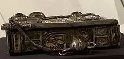 Los paneles laterales largos y cortos contienen inserciones y montajes de diferentes fases. Los lados largos consisten principalmente en contener adornos de animales tradicionales y diseños abstractos. Las monturas dominantes en los lados cortos contienen patrones más sofisticados influenciados por el estilo Ringerike del arte vikingo.[7]