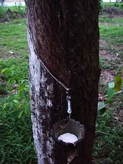 En su lugar de origen, en el centro y sur de América, el caucho ha sido recolectado durante mucho tiempo. Desde mucho antes de la llegada de los europeos, ciertos indígenas del Amazonas lo llamaban cauchuc (‘árbol que llora’), y lo usaron para hacer vasijas y láminas a prueba de agua.[5]