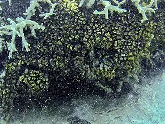 La Lista Roja de Especies Amenazadas de la Unión Internacional para la Conservación de la Naturaleza califica esta especie como de Preocupación menor ver 3.1, a partir de una evaluación de 2008.[1] No obstante, el creciente aumento de la temperatura del mar está incrementando dramáticamente la muerte de corales por blanqueo en todo los océanos, y las proyecciones actuales de los expertos auguran para todo el siglo XXI episodios anuales severos de blanqueo de corales en el 99% de los arrecifes de todo el mundo.[7] De hecho, recientes estudios han constatado que en 2016 ha muerto aproximadamente el 35% de los corales en 84 áreas de las secciones norte y centro de la Gran Barrera de Coral australiana, debido al blanqueo de coral producido por el aumento de la temperatura del mar.[8] También durante 2016, el principal arrecife de Japón, en el archipiélago de Okinawa, sufrió una decoloración por blanqueo del 70% de su extensión, y el arrecife más septentrional del mundo, situado frente a las costas de la isla japonesa de Tsushima, dónde sus aguas templadas suelen evitar episodios de blanqueo, ha sido afectado por primera vez en el 30% de su extensión, según afirma un estudio realizado en diciembre de 2016 por el Instituto Nacional de Estudios Medioambientales de Japón (NIES).[9]