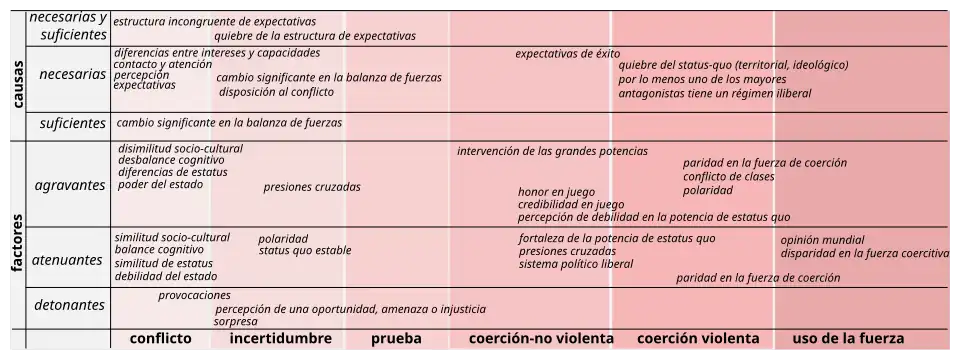 Un conflicto nace cuando una parte desaprueba el desarrollo que toman los acontecimientos de su interés. Primero viene el conflicto, luego la incertidumbre, la prueba y observación, la coerción no violenta, la coerción violenta y por último el uso de la fuerza. Para cada uno de estas fases de desarrollo de la tensión existen causas que pueden ser necesarias, suficientes o necesaria-suficientes y además factores que influyen y que pueden ser caracterizados como atenuantes, agravantes y detonantes.