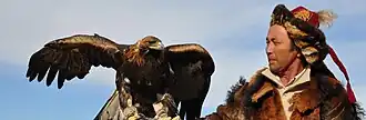 Durante el período comunista en Kazajistán, muchos kazajos huyeron a Mongolia,[10] estableciéndose en la provincia de Bayan-Ölgii y trayendo con ellos su tradición de caza con águilas. Se estima que hay 250 cazadores de águilas en Bayan-Ölgii, que se encuentra en las montañas de Altái en el oeste de Mongolia.[11][12][13] Su costumbre de cetrería consiste en cazar con águilas doradas a caballo, y principalmente cazan zorros rojos y zorros corsac.[14] Usan águilas para cazar zorros y liebres durante los fríos meses de invierno, cuando es más fácil verlos en la nieve.[15][16] Cada mes de octubre, las costumbres de caza del águila kazaja se exhiben en el Festival anual del Águila Dorada.[17][11] Aunque el gobierno de Kazajistán ha hecho esfuerzos para atraer a los practicantes de estas tradiciones kazajas de regreso a Kazajistán, la mayoría de los kazajos han permanecido en Mongolia.