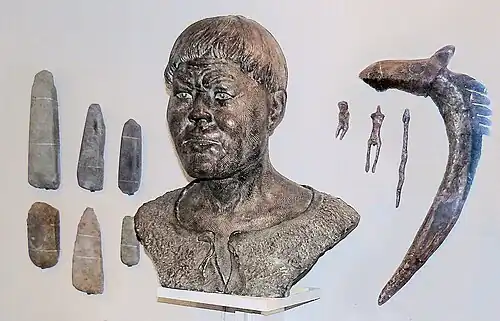 Artefactos y reconstrucción de cazadores-recolectores orientales de la isla Yuzhny Oleny por Gerasimov.[39]