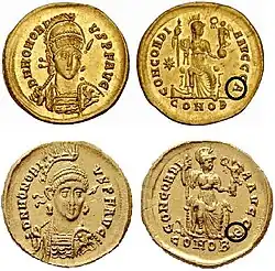 La ceca de Constantinopla, generalmente marcada como CON o CONS, también añadió la forma CONOB(RYZIACUS) para sus monedas de oro (sólidos) en esa época.[21]