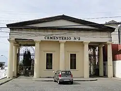 El Cementerio N° 2 se ubica en la planicie del cerro Panteón, siendo el primero entrando al cerro desde el vecino cerro Cárcel por calle Cumming. Desde su costado nace la calle Dinamarca, única que rodea a los tres cementerios del cerro. Su fachada se compone por un atrio cubierto, de estilo neoclásico, rodeado de columnas dóricas.[1][6]