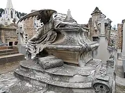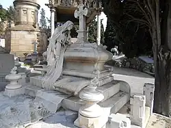 | Sepultura Fortuño Ferrús | Ubaldo Iranzo (a), Josep Campeny (e) | 1902 | Eclecticismo | Baltasar Fortuño Ferrús era un cirujano que emigró a Puerto Rico. Su sepultura presenta un sarcófago decorado con volutas de hojas de acanto, junto al que se encuentra un ángel de formas femeninas, que sostiene en una mano una hoja de palma, símbolo de inmortalidad, y en la otra hojas de adormidera, representando el sueño eterno.[18] | |