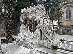 | Sepultura Alomar Estrany | Frederic Aymamí (a), Josep Llimona (e) | 1893 | Eclecticismo | Está compuesta de un sarcófago decorado con relieves de influencia precolombina, así como la figura de un ángel de aspecto femenino, con las alas plegadas y actitud reflexiva. Joaquim Alomar fue un empresario del sector farmacéutico.[20] | |
