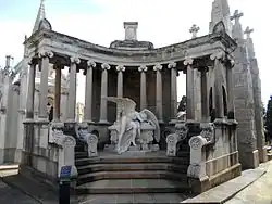 | Panteón August Urrutia | Antoni Vila i Palmés (a), Martínez Fortuny (e) | 1909-1911 | Neoclasicismo | August Urrutia fue un comerciante de cacao enriquecido en Venezuela. Su panteón es uno de las más monumentales del cementerio, muy celebrado por su magnífica ejecución tanto arquitectónica como escultórica. Presenta una loggia de forma semicircular con columnas jónicas, con un pasillo interior al que se accede a través de una escalinata. En el espacio central se halla el sepulcro, sobre el que se apoya un ángel desconsolado, semidesnudo y con las alas desplegadas. En el techo hay un mosaico circular con un ángel y la inscripción «Señor tened misericordia de nosotros». El conjunto estaba coronado por una cruz y un grupo escultórico que se han perdido.[24] | |