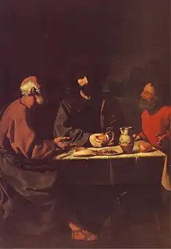 De entre las apariciones de Cristo a sus discípulos después de su Resurrección, una de las más representadas es la de la Cena de Emaús, cuando se apareció a Cleofás y a otro seguidor no identificado, según consta en Lucas (24, 29-31),[1] y brevemente en Marcos (16,12-13).[2] Zurbarán representa el momento cuando: «...(Cristo) estaba en la mesa con ellos, tomó el pan, lo bendijo, lo partió y se lo dio. Entonces se les abrieron los ojos y lo reconocieron.».[3]