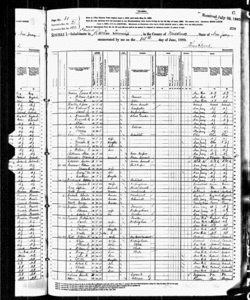![]() Hoja del censo de 1880 con datos correspondientes a East Brunswick, Nueva Jersey. En la línea 12 aparece Thomas Alva Edison. | |||||