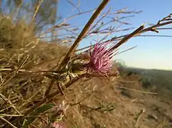 Capítulos terminales, solitarios, con involucro ovado-globoso, con brácteas cubiertas por completo por apéndices imbricados, cóncavos, cuspidado-aristados, enteros y brillantes. Flores tubulares de color púrpura casi todas iguales. Fruto en aquenio, mazudo blanquecino y pubérulo al principio pero se vuelve negro, lustroso y con rayas blancas al madurar. Vilano muy corto o nulo.