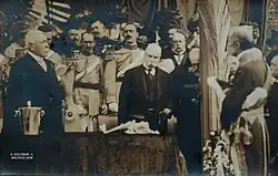 Ceremonia de la colocación de la primera piedra del monumento a Isabel la Católica que obsequia la colonia española. Llegada del señor embajador Polavieja y del señor presidente. Reapertura del Museo Nacional de Arqueología, Historia y Etnografía.