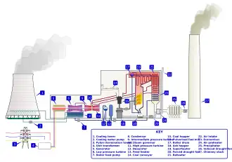 Una central eléctrica de carbón convierte la energía química almacenada en carbón sucesivamente en energía térmica, energía mecánica y, por último, energía eléctrica. El carbón se pulveriza generalmente y luego se quema en una caldera de carbón pulverizado. El calor del horno convierte el agua de la caldera en vapor, que luego se utiliza para girar turbinas que giran generadores. En comparación con una central térmica que quema otros tipos de combustible, se requiere el procesamiento de combustible específico de carbón y la eliminación de cenizas.
