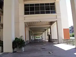 Vista del edificio desde calle Rivadavia, el edificio posee una altura similar a una torre de 11 o 12 pisos.