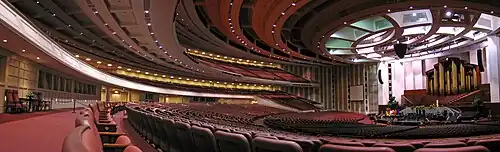 El Centro de Conferencias tiene 130,000 m² con un auditorio principal con 21,000 asientos, que incluye un estrado detrás de un púlpito que da la cara a la audiencia, lugar donde por lo general se sientan 158 oficiales y autoridades generales de la iglesia, así como los 360 miembros del Coro del Tabernáculo. El espacio del auditorio es comparable a dos aviones Boeing 747 uno en frente del otro. Todos los asientos tienen una vista no obstaculizada del púlpito, debido a que los balcones superiores están suspendidos sobre celosías radiales, permitiendo que al llenarse de personas, los balcones puedan descender hasta 15 centímetros de su ubicación inicial. Detrás de los asientos del Coro del Tabernáculo se encuentra el órgano de viento con 7.667 tubos y 130 rangos de tonos. Un chandelier modernista de tres pisos de altura cuelga en una sala del interior del edificio.