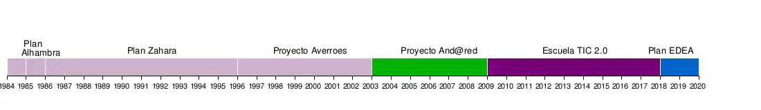 La Red de Centros TIC, fruto del trabajo que la administración pública andaluza, comenzó en el año 1985 con el Plan Alhambra. En el gráfico, se muestran los distintos proyectos emprendidos en Andalucía hasta llegar al Proyecto Andared, al que pertenece la Red de Centros TIC.