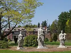 | Elm Bank, estatuas de diosas y la mansión al fondo | ||