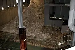 La sala central del enclave arqueológico la ocupan los restos de la muralla medieval islámica que cerraba la ciudad de Al-Mariyya por su frente sur.