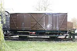 Goods Van N.º 4166 Sin restaurar, usado para almacenaje. Ex-LMS. Comprado a MoD Bicester para almacenamiento por parte del departamento de locomotoras. Almacenado junto al taller de locomotoras al final de la línea de existencias sin restaurar.