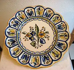 Por su parte, Balbina Martínez Caviró, especialista en estudios toledanos, escribe: "Todos los trabajos salidos de los alfares talaveranos entran dentro de la calificación general de loza, entendiéndose por tal las labores de barro cocido y esmaltado posteriormente mediante un vidriado estannífero que hace impermeables las piezas..." Balbina Martínez Caviró: La cerámica de Talavera. Colección artes y artistas, Instituto Diego Velázquez. C.S.I.C., Madrid, 1969, p. 10. - ↑ De la que se guardan incontables ejemplos de modesta cacharrería, para la que ya no es necesaria la contratación de pintores, y cuyas decoraciones se limitan a bandas polícromas superpuestas con alguna cenefa muy sencilla alternando espacios, o bien esgrafiados lineales, hechos a peine sobre gruesas rayas de oscuro manganeso, o sinusoides con arcos concéntricos o puntos.