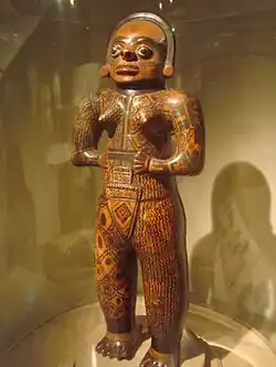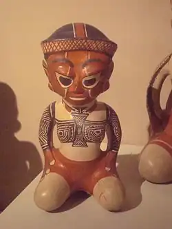 Entre las piezas de cerámica nicoyana, sobresalen una serie de figuras humanas femeninas, modeladas en arcilla, que probablemente representan diosas de la fertilidad. Estas figuras destacan porque pueden sostenerse en pie y, además, poseen una especie de cobertor púbico. Se caracterizan por usar pintura corporal con motivos de animales como el cocodrilo, el jaguar o la serpiente, lo cual es destacable porque, entre las culturas mesoamericanas, la unión mítica del jaguar y la serpiente representa la fertilidad, mientras que en las culturas del área suramericana esta labor correspondía al cocodrilo, lo que vendría a convertir a estas figuras en símbolos de fusión de culturas vecinas y tradiciones mítico-religiosas.[17] Vale mencionar que algunas de estas figuras presentan deformaciones craneales y ojos estrábicos, rasgos estéticos típicos de la cultura maya.[18]