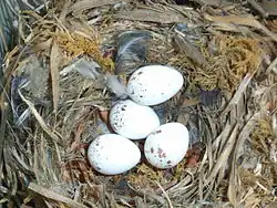 En Europa la nidada generalmente se realiza entre marzo y junio y suele constar de cinco o seis huevos, mientras que en Japón ponen de tres a cinco huevos entre mayo y julio.[4] Los huevos son blancos con finas motas de color rosáceo principalmente en los extremos,[4] miden 16 x 12 mm y pesan 1,2 g de los cuales el 6% es el peso de la cáscara.[7] Los huevos son incubados solamente por la hembra durante 13–17 días hasta que eclosionan sus pollos altriciales cubiertos de pelusa. Los pollos son alimentados por sus dos progenitores aunque solo la hembra los da calor. Tardan unos 15–17 días en desarrollarse.[7] Los juveniles regresan al nido las primeras noches tras abandonarlo. Aproximadamente un 20% de las parejas, principalmente del sur y el oeste, cría una segunda nidada.[4]