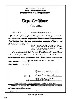 Un certificado de tipo es un documento expedido para indicar la aeronavegabilidad del diseño de tipo de aeronave. El certificado es emitido por una entidad reguladora, y una vez emitido, el diseño no puede ser modificado. El certificado refleja una determinación realizada por la entidad reguladora de que la aeronave está fabricada de acuerdo con un diseño aprobado, y que el diseño asegura la conformidad con los requisitos de aeronavegabilidad. La entidad reguladora compara los documentos de diseño y procesos para determinar si el diseño reúne los requisitos establecidos para el tipo de equipamiento. Los requisitos establecidos por una entidad reguladora típicamente se refieren a Estándares Mínimos de Rendimiento Operativo (MOPS) y están relacionados con documentos (como por ejemplo las series DO-178, DO-160 y DO-254), los cuales están desarrollados conjuntamente por RTCA, Inc. y EUROCAE. Una vez emitido, el "tipo" de aeronave reúne los requisitos apropiados. El proceso de resolución incluye un paso llamado "Primera Inspección de Artículo", para la aeronave y para cada una de sus subcomponentes.