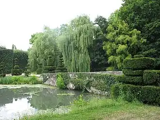 ![]() El estanque del parque del Château d'Ainay-le-Vieil con diversos trabajos de topiaria a su alrededor. | ||