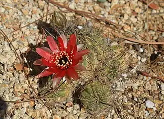 Las flores son de color rojo a naranja, tienen forma de embudo y surgen en la parte superior de la areola.