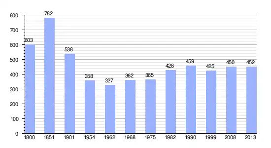 Los datos demográficos contemplados en este gráfico de la comuna de Champdor[4] se han cogido de 1800 a 1999 de la página francesa EHESS/Cassini, y los demás datos de la página del INSEE.[5]