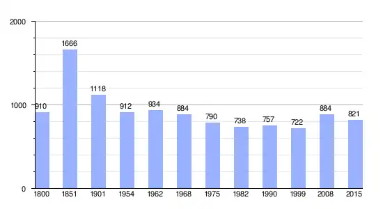 Los datos entre 1800 y 2015 son el resultado de sumar los parciales de las tres comunas que forman la nueva comuna de Charencey, cuyos datos se han cogido de 1800 a 1999, para las comunas de Moussonvilliers,[4] Normandel[5] y Saint-Maurice-lès-Charencey[6] de la página francesa EHESS/Cassini. Los demás datos se han cogido de la página del INSEE.[7]