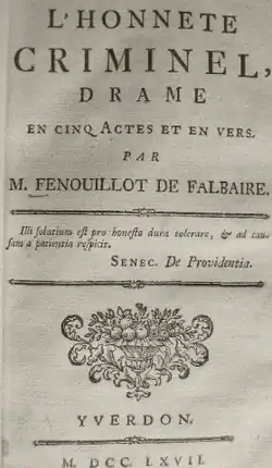 - L’Honnête Criminel, ou l'Amour Filial. Drama en cinco actos, publicado en 1767 y puesto en escena en París por el comediante francés M. de Villeroy el 2 de febrero de 1768; París, Théâtre de la Cour, Comediantes ordinarios de rey, 10 de julio de 1769.[2]