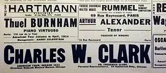 - ↑ "C. W. Clark To Tour England This Fall", The Musical Leader, Volume 27, No. 23, Chicago–New York, 4 June 1914, p. 874.